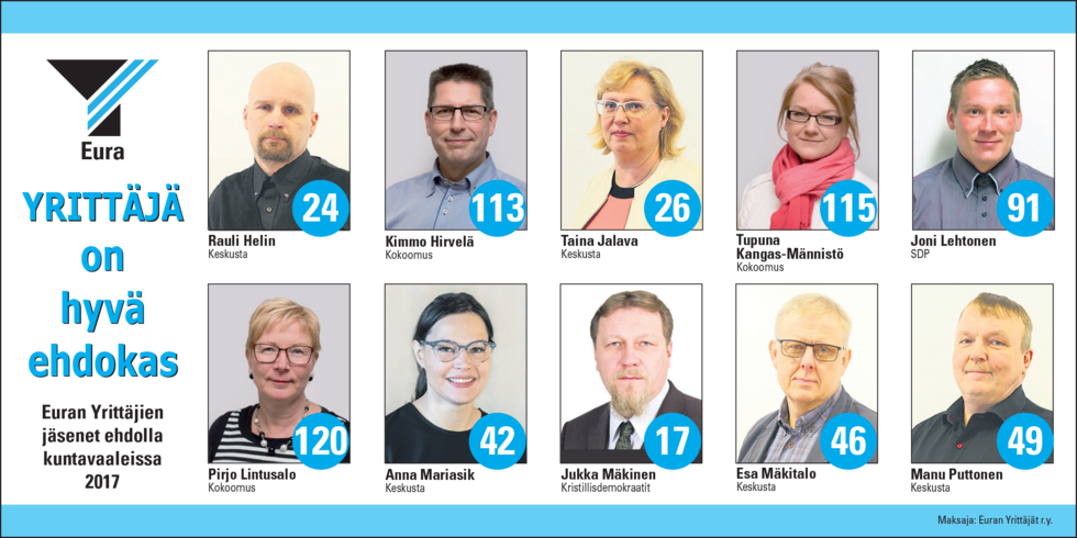Kuntavaalien ennakkoäänestys päättyi tänään 4.4. Varsinainen äänestyspäivä on 9.4. Klikkaa otsikkoa ja katso, ketkä Euran Yrittäjien jäsenistä ovat ehdolla.