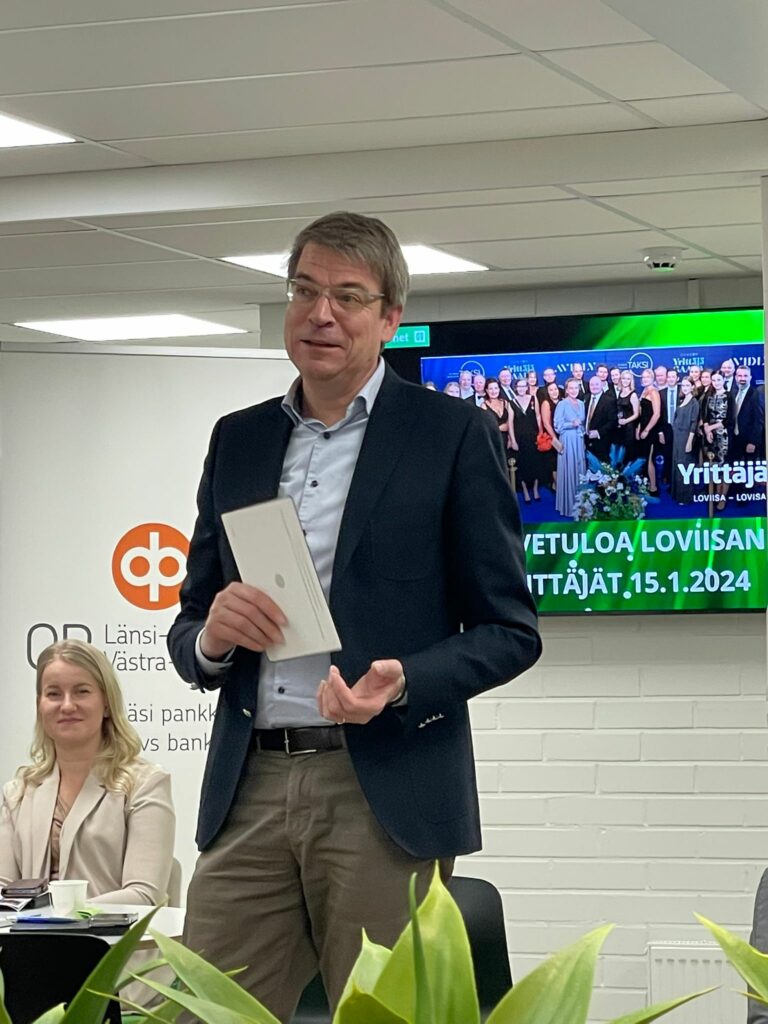Kaupunginjohtaja Tomas Björkroth haluaa kuulla yrittäjiltä heidän toiveitaan ja asioita, jotka pitäisi ottaa esille. Edellisen viikon yritysten kohtaaminen yhteisessä keskustelutilaisuudessa Laivasillan alueesta oli hyvä esimerkki siitä, miten yhdessä toimien voidaan viedä asioita eteenpäin. Hän painotti kaupungin roolia ja selkeytti, mikä on kaupungin ja mikä yrittäjien vastuulla. Kaupunki ei voi tukea yksittäistä yrittäjää, mutta kaupunki voi parantaa yrittäjien toimintaympäristöä. Hän muistutti myös Cursorin, alueellisen kehitysyhtiön, palveluiden käyttämisestä ja toivoi yrittäjiltä ideoita, joihin kaupunki voi tarttua.
