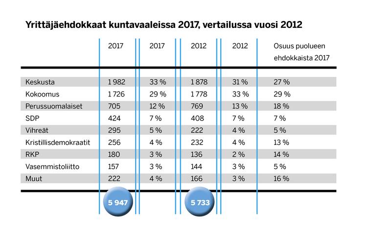 Huhtikuisissa kuntavaaleissa on ehdolla 5947 yrittäjäehdokasta. Yrittäjäehdokkaiden määrä kasvoi edellisiin vuoden 2012 kuntavaaleihin verrattuna noin 500 ehdokkaalla.
